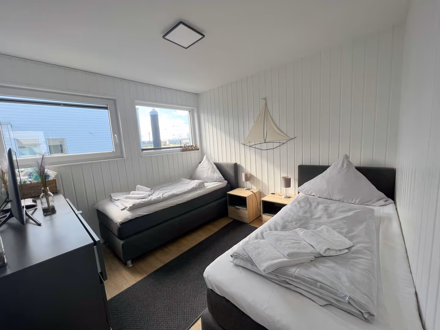 Willkommen in Ihrem Traumferienhaus! Stellen Sie sich vor Sie wachen im schwimmenden Ferienhaus "AM PIER“ mit direktem Blick aufs Wasser auf. Dieses exklusive Ferienhaus bietet Ihnen alles, was Sie für einen unvergesslichen Urlaub benötigen. Die finnische Sauna lädt zum Entspannen und Abschalten ein, während Sie den Alltagstress hinter sich lassen. Die 30m² große Dachterrasse bietet den atemberaubenden 360° Blick auf die malerische Schönheit der Ostsee und des Ostseefjords Schlei und ist der perfekte Ort, um den Sonnenuntergang in der Hängematte zu genießen. Für alle Wassersportliebhaber steht ein eigener Bootssteg zur Verfügung. Hier können Sie Ihr eigenes Boot anlegen. Ob Sie angeln, schwimmen oder einfach nur die Ruhe auf dem Wasser genießen möchten, dieses Ferienhaus erfüllt all Ihre Wünsche. Das Ferienhaus selbst ist mit viel Liebe zum Detail eingerichtet und bietet höchsten Komfort und Luxus. Der großzügige Wohn- und Essbereich lädt zum Verweilen ein und bietet auch Platz für Gäste. Die vollausgestattete Küche ermöglicht es Ihnen Ihre Lieblingsgerichte zuzubereiten. Die Schlafzimmer sind gemütlich und stilvoll gestaltet und bieten Ihnen eine erholsame Nachtruhe. Jedes Zimmer verfügt über einen LED-TV und luxuriöse Boxspringbetten. Das Hauptschlafzimmer bietet einen exklusiven Blick auf das Wasser direkt aus dem Bett. Ein privater Parkplatz in der Nähe des schwimmenden Stegs vervollständigt dieses Angebot. Die Lage des Ferienhauses ist ideal für Naturliebhaber und bietet zahlreiche Möglichkeiten für Outdoor- Aktivitäten: Wandern, Radfahren oder einfach nur die Umgebung erkunden. Hier finden Sie alles, was das Herz begehrt. Wir freuen uns darauf, Sie in diesem besonderen Ferienhaus willkommen zu heißen und Ihnen einen unvergesslichen Aufenthalt zu bieten. Zögern Sie nicht, uns bei weiteren Fragen zu kontaktieren. Unser Lieblingsplatz ist in der Hängematte auf der Dachterrasse die Seele baumeln zu lassen - Urlaub PUR!